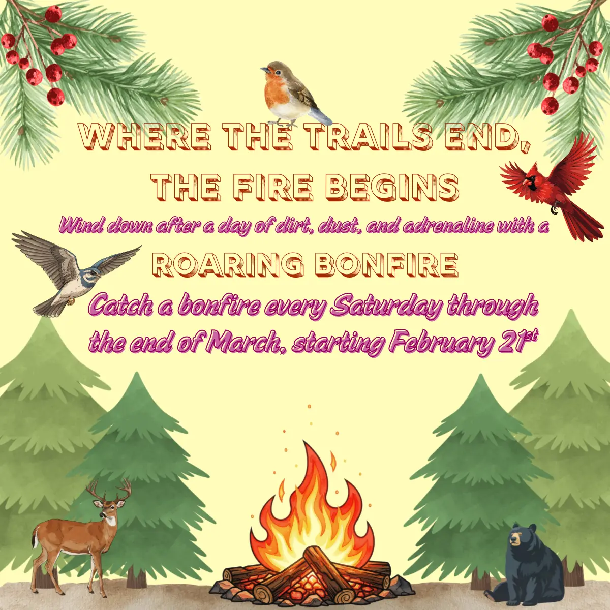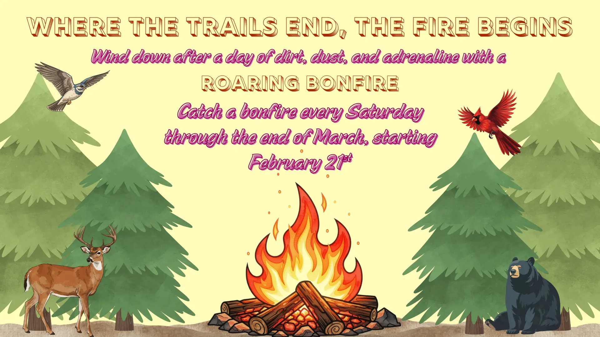 Starting February 21st and running through the end of March, join us every Saturday night for a laid-back post-ride hangout. The bonfire starts once the sun goes down and is included with regular parking passes. Bring your friends, swap trail stories, warm up by the fire, and enjoy the off-road lifestyle the way it was meant to be.